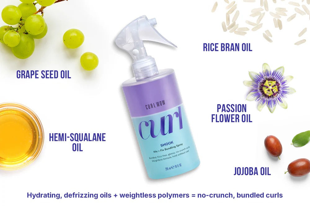 - Shook Mix + Fix Bundling Hair Spray breakthrough, bi-phase styling spray combines powerful hydrators + crunch-free polymers for perfectly bundled, glossy, frizz-free curls.